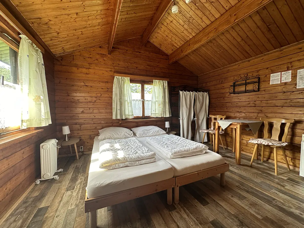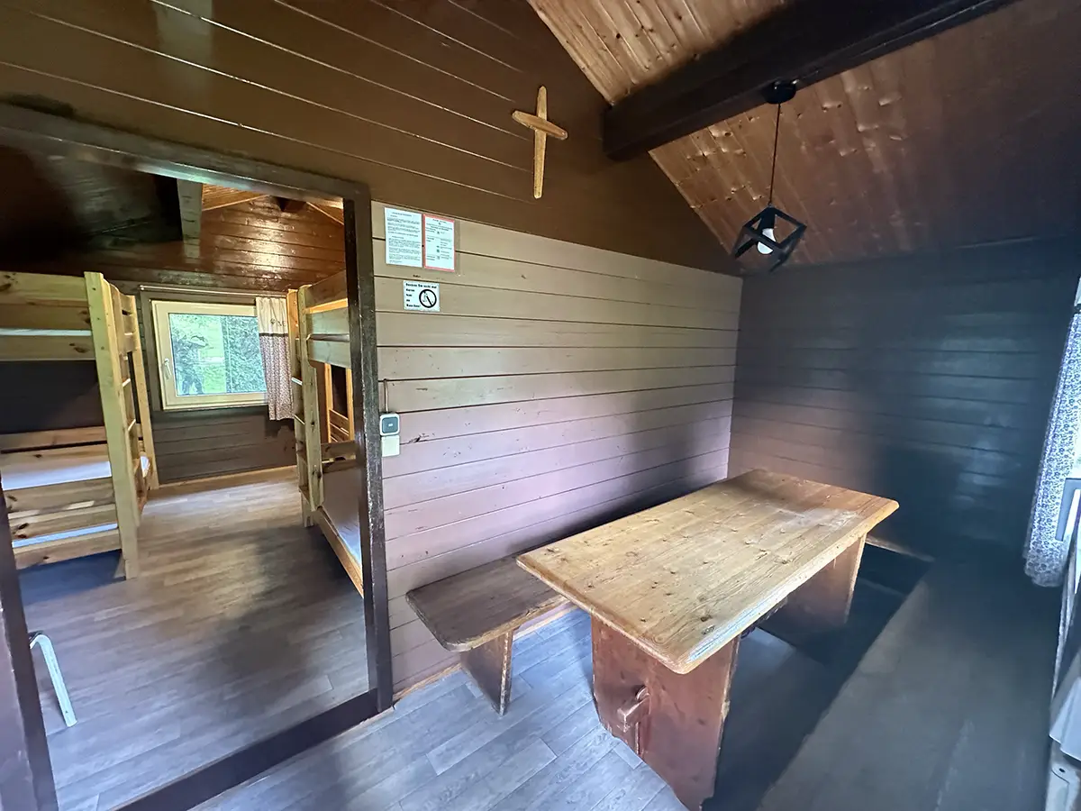 Ausgestattet sind die rustikalen Blockhäuser mit Etagenbetten, Schrankregalen für das Gepäck, einer kleinen Kochstelle und einer gemütlichen Sitzecke. Die Heizung lässt das Blockhaus auch im Winter zu einer warmen und gemütlichen Unterkunft werden.