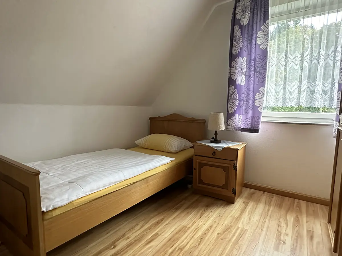 Das Pastorenhaus für vier Personen hat zwei Schlafräume, ein Wohnzimmer, ein Badezimmer und eine Küche.