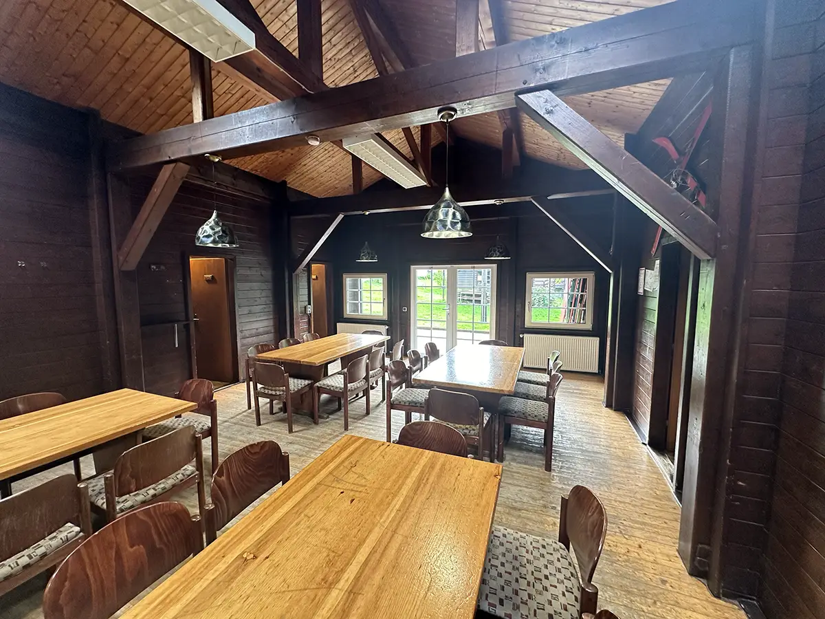 Das Gästehaus mit seinem Gemeinschaftsraum kann Gruppen bis zu 32 Personen in 8 Zimmern zu je 4 Betten aufnehmen. Jedes Zimmer hat fließend kalt und warm Wasser.